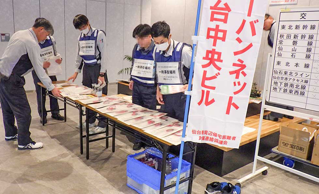 アーバンネット仙台中央ビルメックスセンタは、一時滞在施設として機能させるための準備と運営を担う。共通訓練では施設の安全点検、受入れ場所の整備、のぼり旗設置などを実施。さらに一時滞在場所運営訓練として、帰宅困難者の受入れと受付、施設利用ルールの周知、物資配布、現地対策本部との交通情報連携を行い、災害時の受入体制を総合的に確認