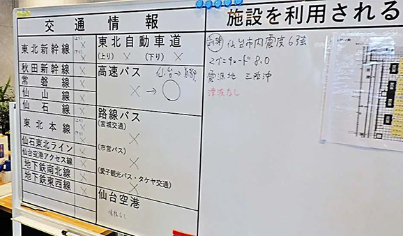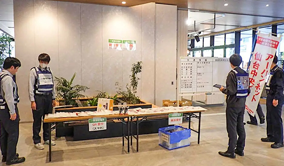 アーバンネット仙台中央ビルは一時滞在場所として、帰宅困難者の受入(QRコードまたは用紙での受付)、滞在スペースの指定、案内、備蓄物資の配布、帰宅困難者への情報提供等を行うため、同ビルメックスセンタ常駐社員が対応しました。
